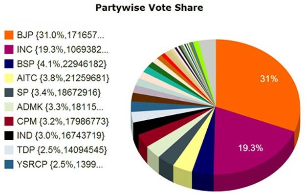 ഭാരതീയ ജനതാ പാര്ട്ടിക്ക് 17,16,57,549 വോട്ട് (31 ശതമാനം)