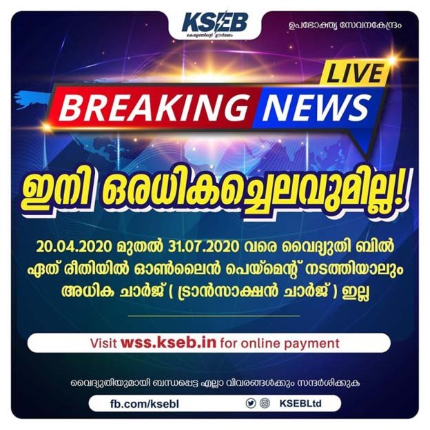 ഇന്ന് -2020 ഏപ്രില് 20 -മുതല് ഓണ്ലൈന് പേമെന്റ് നടത്തുന്നവരില് നിന്ന് ഒരു തരത്തിലുള്ള അധിക ചാര്ജ്ജും ഈടാക്കേണ്ടതില്ലെന്ന് വൈദ്യുതി ബോര്ഡ് തീരുമാനിച്ചു. ഇത്തരത്തില് ട്രാന്സാക്ഷന് ചാര്ജ്ജ് ഇല്ലാതെ വൈദ്യുതി ചാര്ജ്ജ് അടയ്ക്കാനാവുന്നത് മൂന്നര മാസത്തേക്കാണ് -2020 ജൂലൈ 31 വരെ.