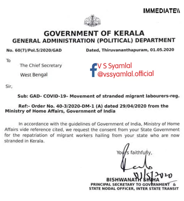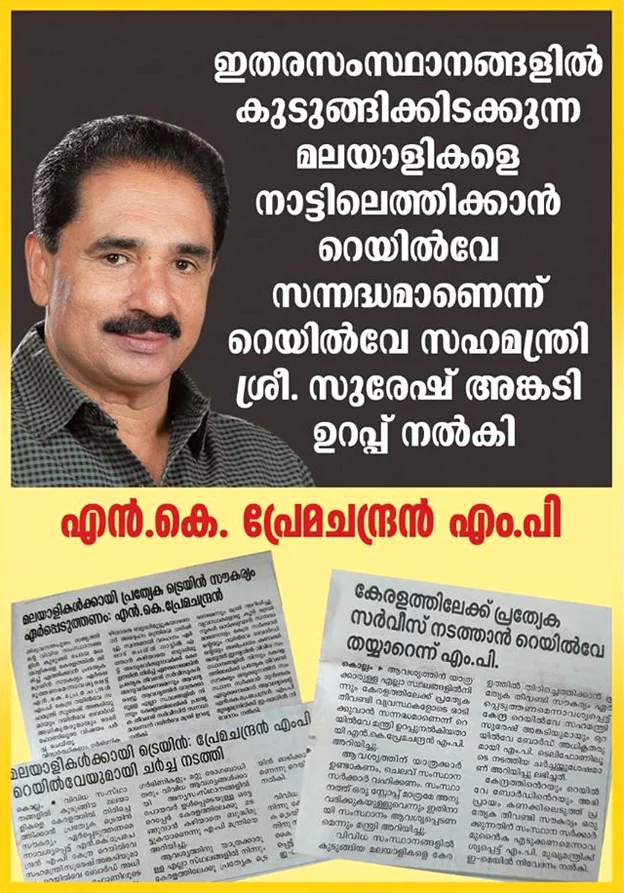 പ്രേമചന്ദ്രന്റെ കള്ളം അനായാസം തെളിയിക്കാന് കഴിയുന്ന വേറെയും രേഖകളുണ്ട്. കേരളത്തിന്റെ അപേക്ഷ പ്രകാരം ഒഡിഷയിലേക്ക് പ്രത്യേക ട്രെയിന് അനുവദിച്ചിരിക്കുന്നു എന്ന ദക്ഷിണ റെയില്വേ വിജ്ഞാപനമാണ് അതിലൊന്ന്. തൊഴിലാളികളെ അയച്ചാല് സ്വീകരിക്കാമോ എന്നു ചോദിച്ച് ബംഗാള് സര്ക്കാരിന് കേരളമയച്ച കത്ത് മറ്റൊരു തെളിവ്. കേരളത്തില് നിന്ന് അതിഥി തൊഴിലാളികളെയും കൊണ്ട് 26 ശ്രമിക് എക്സ്പ്രസ്സുകളാണ് മറ്റു സംസ്ഥാനങ്ങളിലേക്കു പോയത്. ഇതെല്ലാം കേരളത്തിന്റെ അഭ്യര്ത്ഥന പ്രകാരം അനുവദിക്കപ്പെട്ടതാണ്. വെറുതെ ആവശ്യപ്പെട്ടതു കൊണ്ടു മാത്രം കാര്യമില്ല. യാത്രക്കാരെ കണ്ടെത്തുക, അവരുടെ വിലാസവും ഫോണ് നമ്പരും ടിക്കറ്റിനുള്ള പണവും ശേഖരിച്ച് റെയില്വേക്കു കൈമാറുക, അവര്ക്ക് കോവിഡ്-19 രോഗലക്ഷണങ്ങള് ഇല്ലെന്ന് ഉറപ്പാക്കുക എന്നീ ചുമതലകളെല്ലാം നിര്വ്വഹിക്കണം. കേരളം ഇതെല്ലാം നിറവേറ്റി. പല സ്ഥലത്തായി ചിതറിക്കിടക്കുന്ന മലയാളികളെ ഏകോപിപ്പിച്ച് സ്റ്റേഷനിലെത്തിക്കാനൊന്നും മറ്റു സംസ്ഥാനങ്ങള് തയ്യാറല്ല. അതുകൊണ്ട് ട്രെയിനും വന്നില്ല.
