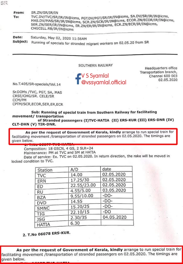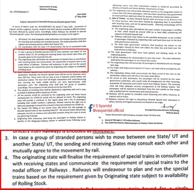 ഈ വരികള് വളരെ പ്രധാനപ്പെട്ടതാണ്. മെയ് 2ന് റെയില്വേ മന്ത്രാലയം പുറപ്പെടുവിച്ച ഉത്തരവെന്നോ സര്ക്കുലറെന്നോ പറയാവുന്ന രേഖയിലെ പോയിന്റ് 4 ആണിത്. ഒരു ജനപ്രതിനിധി ഒരുളുപ്പുമില്ലാതെ എഴുന്നള്ളിക്കുന്നത് പച്ചക്കള്ളമാണെന്നതിന്റെ പച്ചയായ തെളിവാണിത്. അതിനെക്കുറിച്ച് ചര്ച്ച തുടങ്ങുമ്പോള് തന്നെ ഈ വരികള് നമുക്കു മുന്നില് വേണം.