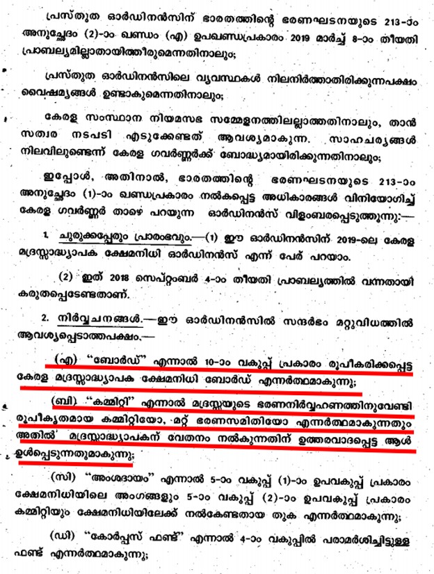 2019 മാർച്ച് 1ന് വിളംബരം ചെയ്ത കേരള മദ്രസ അധ്യാപക ക്ഷേമനിധി ഓർഡിനൻസിൽ മദ്രസ അധ്യാപകർക്ക് ശമ്പളം നൽകുന്നത് എങ്ങനെയാണെന്ന് വ്യക്തമായി എഴുതിയിട്ടുണ്ട്. ഇതു പിന്നീട് ബില്ലായി നിയമസഭയിൽ കൊണ്ടുവന്ന് 2010 നവംബർ 19ന് പാസാക്കി. ഇതുപ്രകാരം മദ്രസ അധ്യാപർക്ക് സർക്കാർ ശമ്പളം നൽകുന്നില്ല. മദ്രസ അധ്യാപകർക്ക് സർക്കാർ ഒരു ക്ഷേമനിധി രൂപീകരിച്ചു നൽകിയിട്ടുണ്ട്. ഈ വേളയിൽ കോർപ്പസ് ധനം സർക്കാർ നൽകിയിട്ടുണ്ട്. ഇതല്ലാതെ യാതൊരു ഫണ്ടും സർക്കാരിന്റെതില്ല. ഈ ക്ഷേമനിധിയിൽ മദ്രസ മാനേജ്മെന്റും മദ്രസയിലെ അധ്യാപരും അംഗങ്ങളാണ്. ഇരു കൂട്ടരും ഇതിൽ പണം നിക്ഷേപിക്കേണ്ടതുണ്ട്. ഈ പണം സൂക്ഷിക്കുന്നത് സർക്കാർ ട്രഷറിയിലാണ്. ഇതിൻറെ പലിശ പോലും ക്ഷേമനിധി യഥാർഥത്തിൽ വാങ്ങുന്നില്ല.