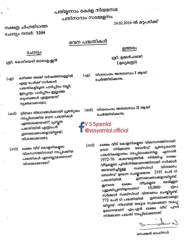 രേഖ തപ്പിയെടുക്കാന് അധികം ബുദ്ധിമുട്ടേണ്ടി വന്നില്ല. നിയമസഭയില് നിന്നു തന്നെ കിട്ടി. സഭയില് പറയുന്നത് ഉമ്മന് ചാണ്ടി തന്നെയാവുമ്പോള് പിന്നെ അവിശ്വസിക്കേണ്ട കാര്യമില്ലല്ലോ. യു.ഡി.എഫ്. സര്ക്കാരിന്റെ കാലാവധി അവസാനിക്കുന്നതിനു തൊട്ടുമുമ്പ് ചേര്ന്ന പതിനാറാം നിയമസഭാ സമ്മേളന വേളയില് 2016 ഫെബ്രുവരി 24ന് അന്നത്തെ പ്രതിപക്ഷ ഉപനേതാവ് കോടിയേരി ബാലകൃഷ്ണന് ഒരു ചോദ്യം ഉന്നയിച്ചിരുന്നു. യു.ഡി.എഫ്. സര്ക്കാര് 5 വര്ഷത്തിനുള്ളില് സര്ക്കാര് പദ്ധതികളിലൂടെ എത്ര പേര്ക്ക് പാര്പ്പിടം നല്കി എന്നായിരുന്നു പ്രധാന ചോദ്യം. ഇപ്പോഴും പാര്പ്പിടമില്ലാത്ത കുടുംബങ്ങള് എത്രയെന്ന് വ്യക്തമാക്കാമോ എന്നായിരുന്നു മറ്റൊരു ചോദ്യം.