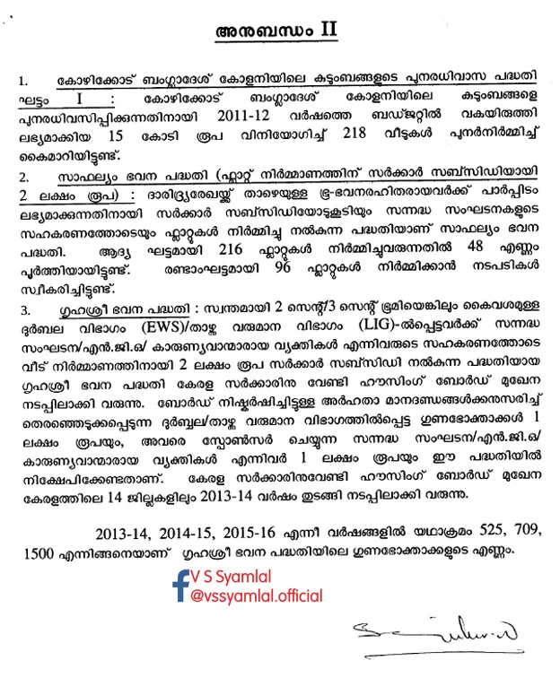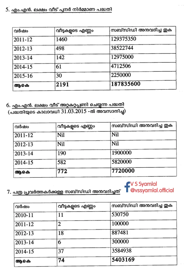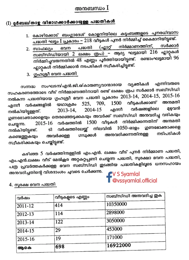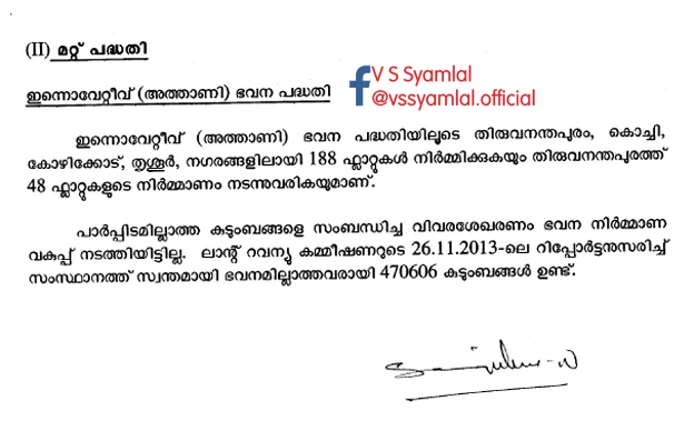 ഉമ്മന് ചാണ്ടി സര്ക്കാരിന്റെ കാലത്തെ യഥാര്ത്ഥ കണക്കായ 3,343 വീടുകളും പിണറായി സര്ക്കാരിന്റെ കാലത്തെ 2,14,144 വീടുകളം കഴിച്ചാല് കണക്കുപ്രകാരം 2,53,049 ഭവനരഹിതര് ഇപ്പോഴുമുണ്ട്. അതിനാല്ത്തന്നെയാണ് മുഖ്യമന്ത്രി പിണറായി വിജയന് പറഞ്ഞത് ലക്ഷ്യം പകുതിപോലുമായിട്ടില്ലെന്ന്.